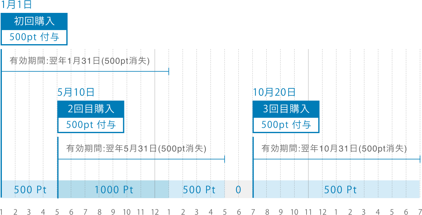ポイントの有効期限は、ポイント付与月から1年間です。